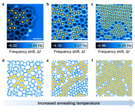 图1. 原子尺度观测二维冰的无临界核结晶过程,随着退火温度升高,黄点标注的六元环晶体结构经历从枝状到岛状的结构演化。a-c. 原子力显微镜成像图; d-f. 分子动力学模拟结果。