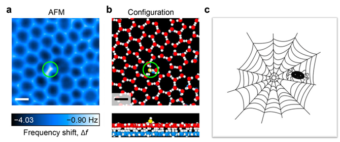 图2. 表面吸附分子诱导的二维晶化机制。a-b. 二维冰表面吸附分子的(a)原子力显微镜实验图和(b)三维空间构型图,绿色圆圈位置标注了二维冰生长前沿处的吸附分子。c. 该三维诱导的二维晶化,类似“蜘蛛结网”的过程(图片来源网络)。