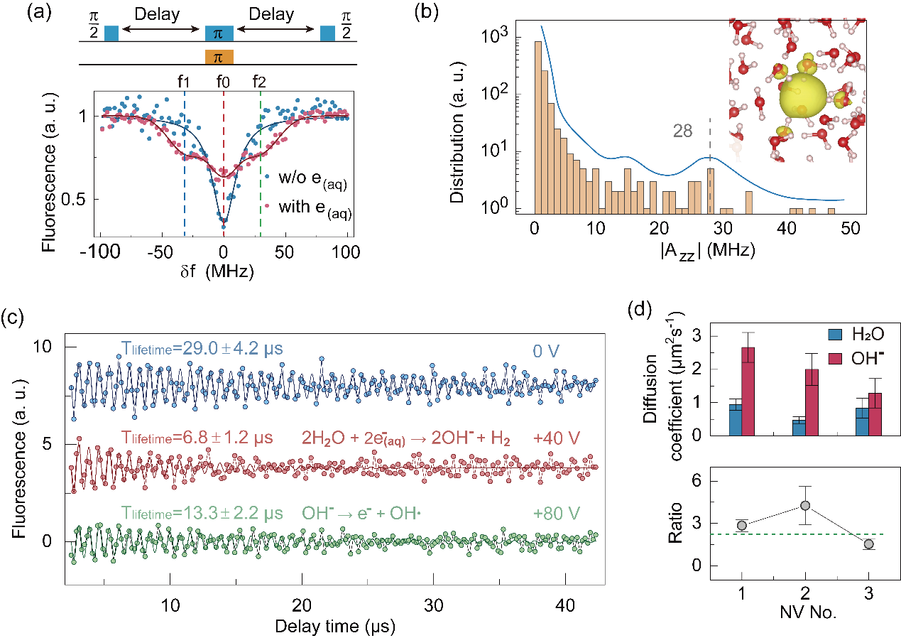 图2 a)单个NV的DEER测量。当产生eˉ(aq)时,在f1=1.513 GHz和f2=1.574 GHz处出现两个伴峰,来源于eˉ(aq)与周围质子的超精细相互作用。b)DFT计算得到的超精细相互作用|Azz|值分布,在28 MHz附近显示了极大值。插图:模拟所得的eˉ(aq)代表性结构之一。c)不同针尖偏压下单个NV的XY8-4关联谱数据,其衰减速度表示H₂O和OHˉ中质子的扩散速度。d)界面H₂O和OHˉ中质子扩散系数比值。来源:美国物理学会《物理评论快报》论文。